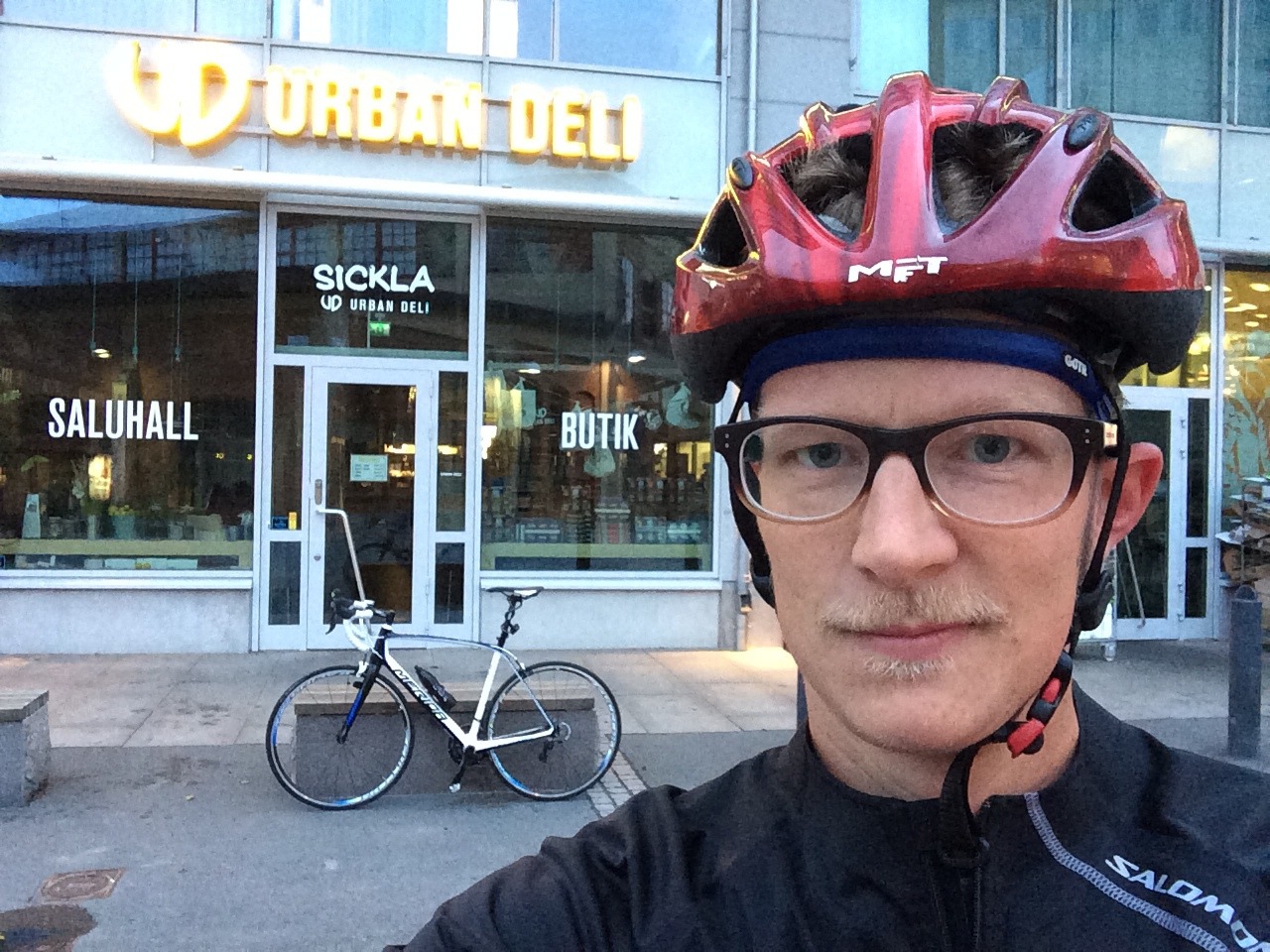 Premiär för Le Peleton, snabb morgoncykling 06:00 på onsdagar. Jag var lite väl tidig; alarmet på 04:45 och vid Urban Deli Sickla redan 05:30. Jobbigt att komma upp men skönt att cykla. Lite trist