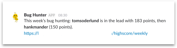 The result is the Bug Hunter Game, a simple web service build in Node.js. It listens to webhooks coming in from GitHub, and it runs a scheduled task every morning, posting a short message to Slack: